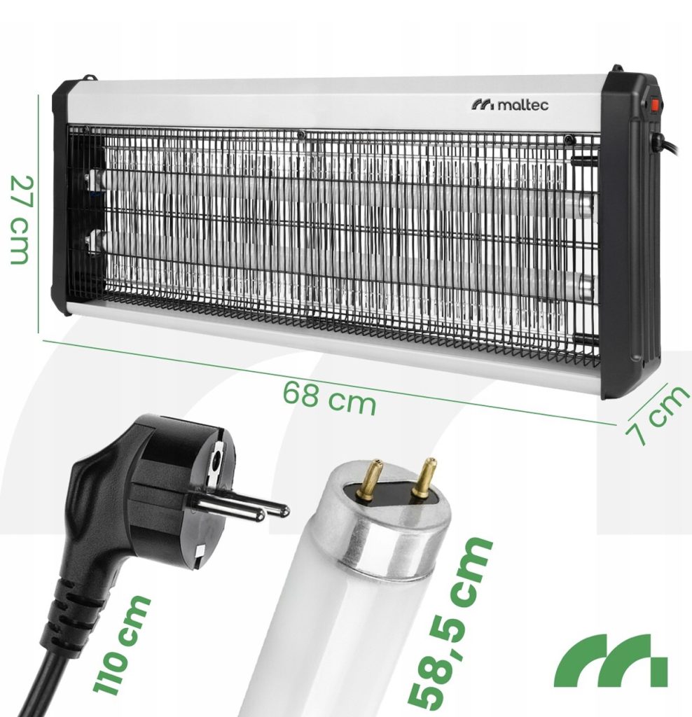 Пастка-знищувач комах Maltec EGO-02-40W працює від мережі 220-240 V, має низьке енергоспоживання. Дотримуйтесь правил експлуатації електроприладів, при заміні ламп відключайте подачу електрики. Розташовуйте виріб подалі від джерел тепла та відкритого полум’я.